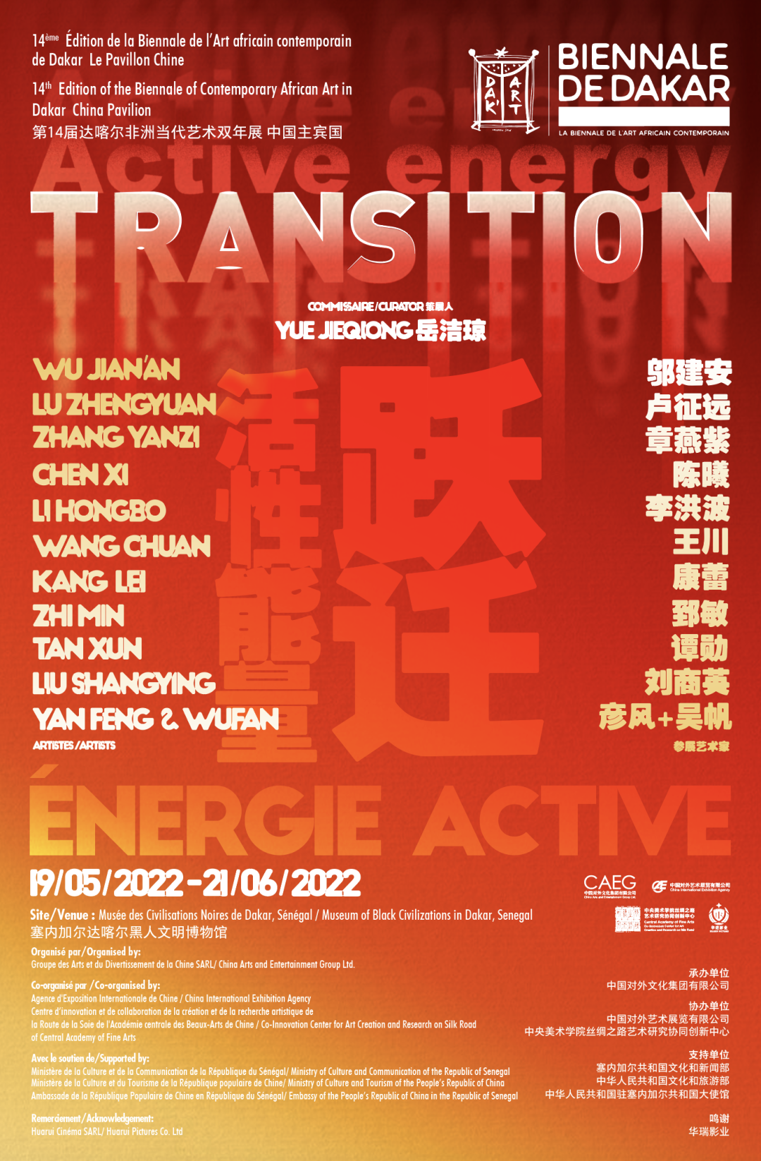 中國主賓國展覽策展人岳潔瓊以“躍遷/活性能量”為策展理念,遴選了中國藝術家鄔建安、劉商英、李洪波、郅敏、譚勛、陳曦、章燕紫、王川、盧征遠、康蕾、彥風和吳帆的24件(套)作品,包含繪畫、雕塑、裝置和影像等多種藝術門類,旨在呈現中國當代藝術生態在全球性與本土化語境下的探索,表達“和而不同”“共生共榮”的文化愿景。中國和非洲國家的當代藝術作品在達喀爾雙年展上交相輝映,呈現出一幅世界文化多樣性和不同文明交流互鑒的優美畫卷。