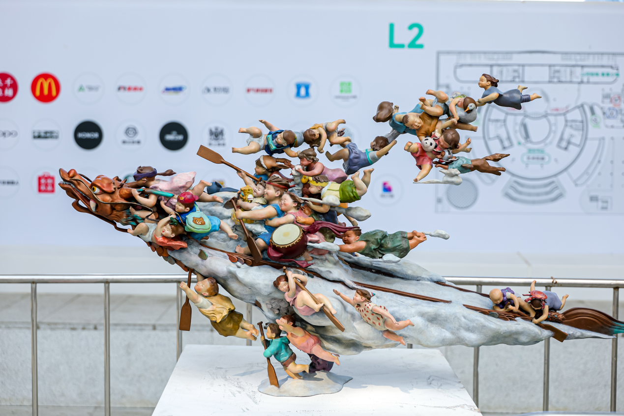 除新質(zhì)影像作品,展覽現(xiàn)場還融合了其它公共藝術(shù)裝置、多媒體燈箱等多形式藝術(shù)創(chuàng)作,進(jìn)一步激活了展覽場域的空間聯(lián)結(jié),深化公眾參與體驗。深圳藝術(shù)家鄭躍飛創(chuàng)作的公共裝置《星之塔》,采用可持續(xù)環(huán)保板材與創(chuàng)新榫卯結(jié)構(gòu)搭建而成,裝置層層向上延展,在空間中構(gòu)筑出星穹般的浪漫意象,生動呼應(yīng)“青年匯聚·創(chuàng)造無界”的展覽主題。藝術(shù)家沈夢瑤的《踏夢神舟》借嶺南龍舟文化,以超現(xiàn)實手法,展現(xiàn)團(tuán)隊協(xié)作等龍舟精神,承載青年憧憬,追求“超越無界、奔赴未來”的意境。